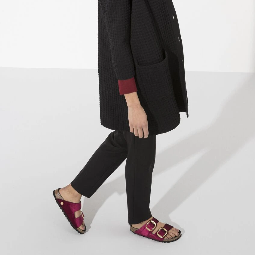 After party ready. Smooth, velvety fabric gives the Arizona’s iconic, two-strap design a subtle shimmer for the season. The soft pink style pairs perfectly with shiny, oversized buckles and a tonal, smooth leather footbed for a luxe look inside and out. Complete with go-all-night comfort from the original contoured BIRKENSTOCK footbed.