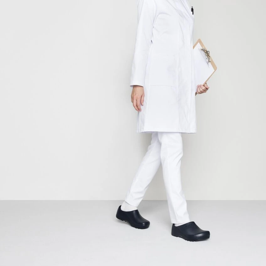 BIRKENSTOCK developed the Profi Birki to offer perfect grip and sure-footedness in almost any work environment. With its raised heel section and extended front, it encloses the entire foot and promotes a natural rolling motion with every step you take. The Profi Birki is a top choice among long-term employees in hospitals, the food industry, and kitchens. Its outstanding hygiene properties likewise attest to this: the oil- and grease-resistant clog is washable at up to 80° Celsius, while the removable PU footbed can be washed at up to 60° Celsius and can also be disinfected.